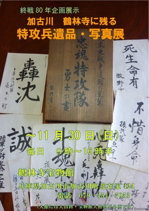 加古川 鶴林寺に残る特攻兵遺品・写真展 2025.08.22 終戦80年企画展示として、「加古川 鶴林寺に残る特攻兵遺品・写真展」を宝物館にて11月末まで行っています。 鶴林寺近くの中村屋旅館には、戦争末期に出撃を控えた特攻隊員が宿泊していました。戦後、大空に散った隊員たちを偲んで中村屋に忠魂碑が建立されました。 その後、平成13年(2001年)に鶴林寺に忠魂碑が移設されたことに伴い、中村屋に託されておりました遺書・遺稿・血書・遺品等も、当寺で大切にお預かりしております。