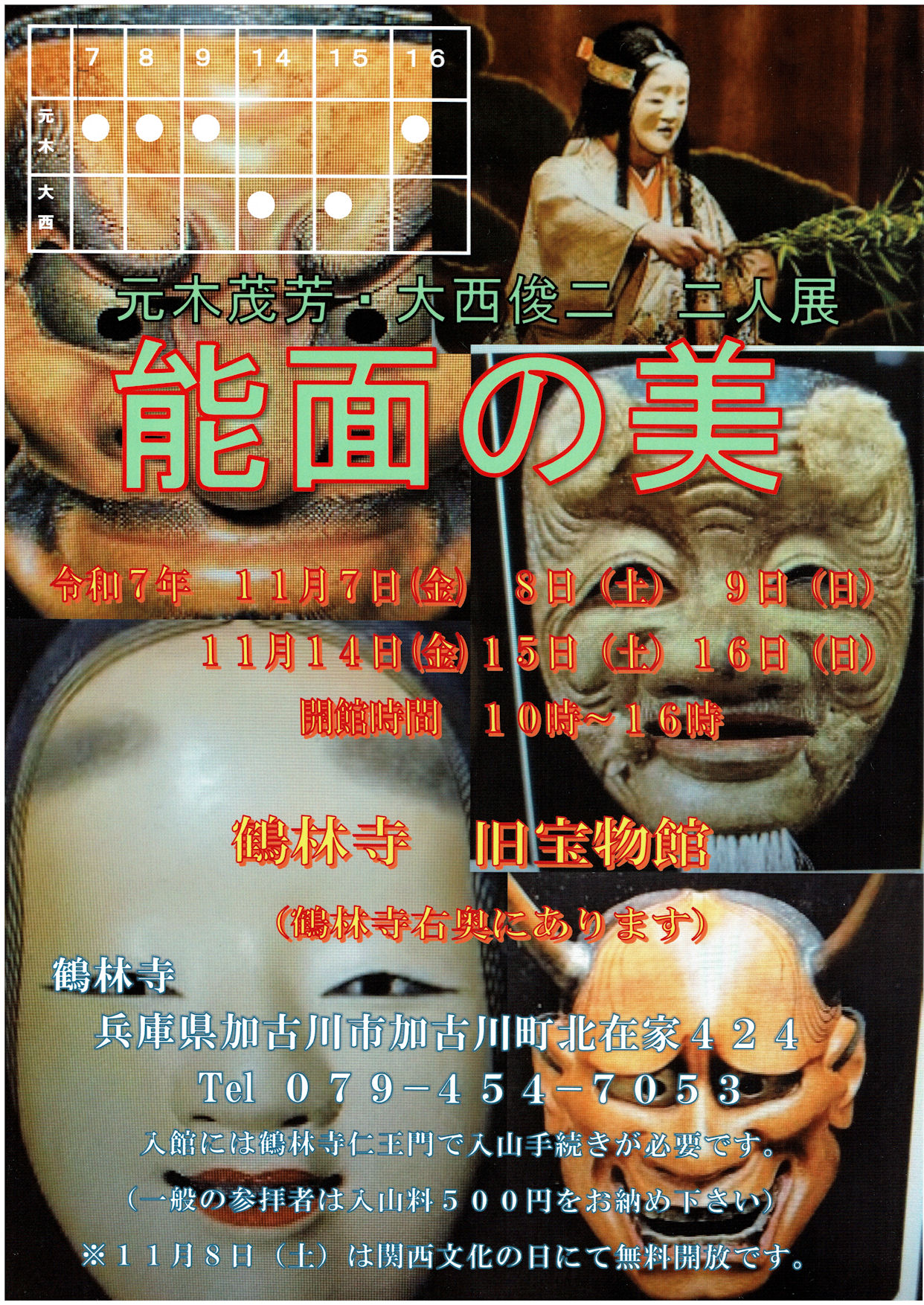 能面の美 展示会(11月7~9日、14~16日) 2025.10.28 11月7日~9日、および14日~16日の計6日間、それぞれ10時~16時に、鶴林寺旧宝物館にて能面の展示を行います。 異なる流派の二人の能面師による作品です。深遠なる美をお楽しみください。