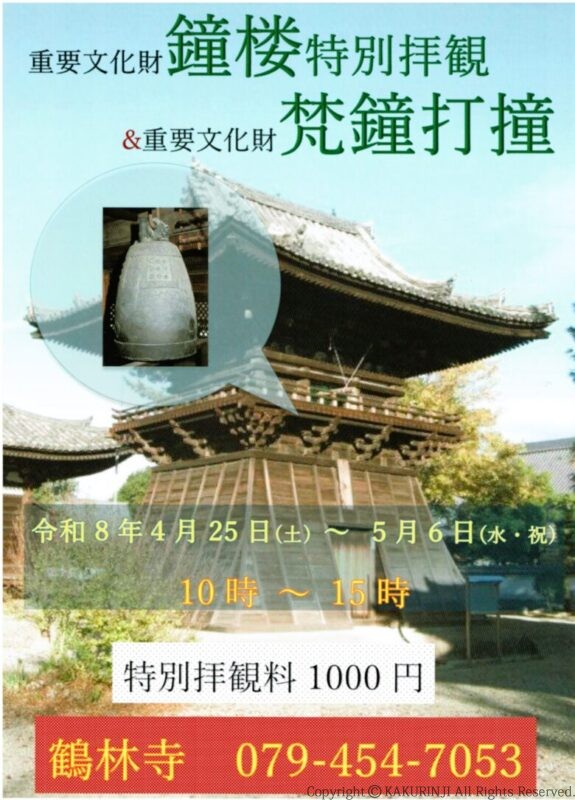 連休中4月25日~5月6日の10時~15時の期間限定で、鶴林寺の重要文化財である鐘楼(鐘つき堂)の特別拝観&鐘つき体験を行います。